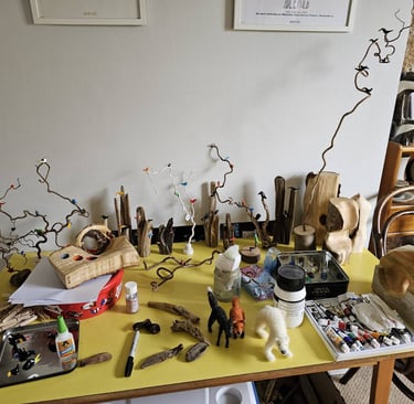 I'm not very good at doing nothing. My mind wanders and my hands like to make things. I'm fascinated by wood. Driftwood, interesting twigs and logs all end up back at my home and become things my mind and hands decide they should be. Small bits are homes for Quentin Blake inspired birds and large pieces become Barbra Hepworth / David Nash inspired book shelf sculpture which are as much to touch as to look at. In the winter I also like to make felt characters, often penguins but occasionally other things appear.